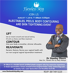 Come the 11th of August 2018, our Medical Director, Dr Stanley Okoro will spend all day at the skin clinic for the Injectables, Peels and Body contouring event. This event is free and open for all.Dr Okoro is an internationally renowned, double-board certified plastic surgeon; with extensive experience in facial rejuvenation, breast reconstruction/augmentation and body contouring.